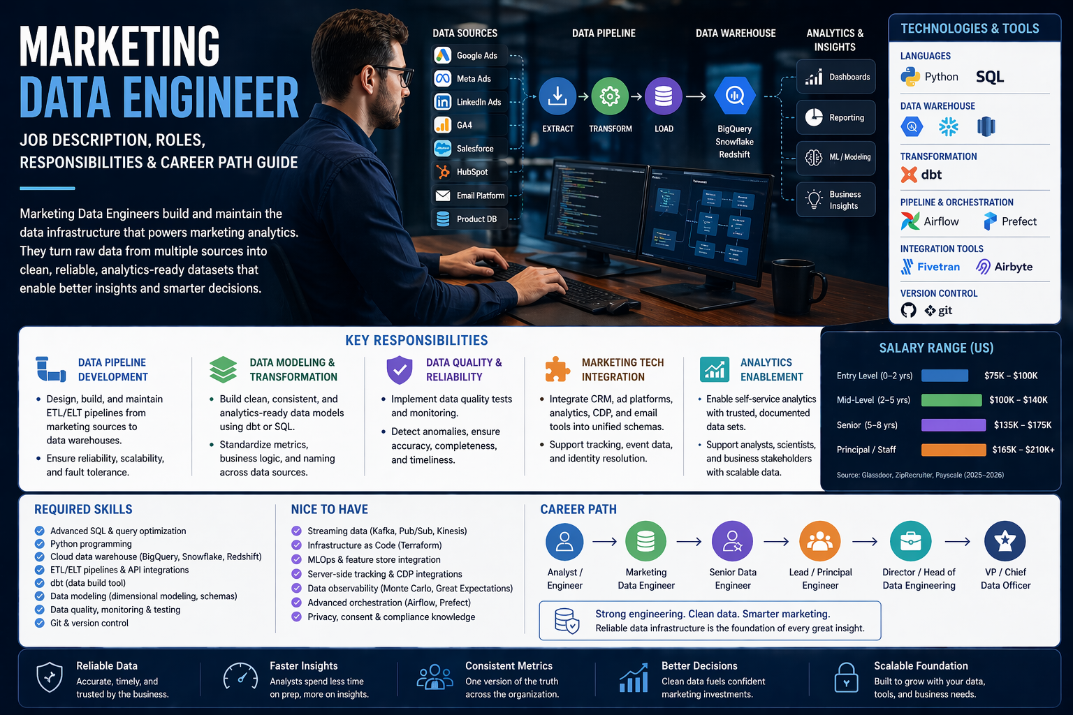 The Marketing Data Engineer role commands strong compensation reflecting both the technical complexity of the role and the growing organizational awareness of data infrastructure as a strategic asset. The following figures reflect US market data from Glassdoor, ZipRecruiter, and industry benchmarks as of 2025–2026.