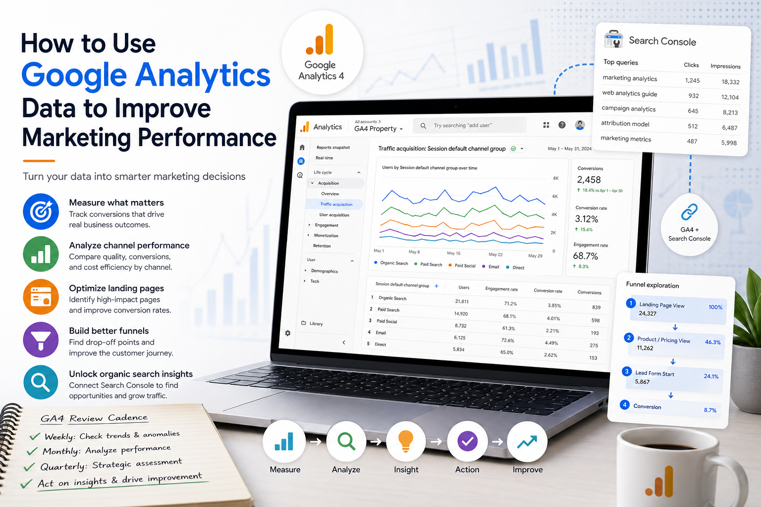 GA4 is a good tool. It is not a great tool for every use case, and it has well-documented limitations โ particularly around cross-device tracking, attribution accuracy, and the granularity of its organic search data. But used systematically and connected to actual decisions, it is more than capable of driving meaningful improvement in marketing performance for the vast majority of organizations. The teams that do not get value from it are almost always the teams that look at the wrong reports, track the wrong conversions, or review the data without a question in mind.