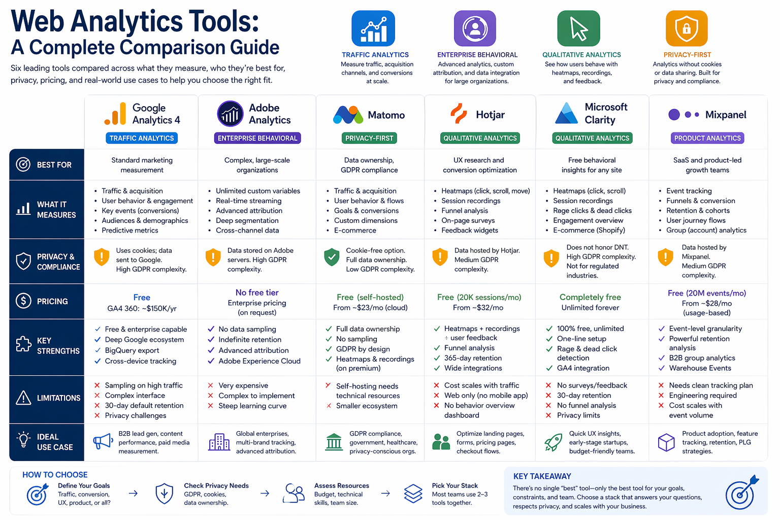 Web analytics tools are not interchangeable. Each one solves a distinct measurement problem, and choosing the right combination matters more than choosing the most popular single tool.